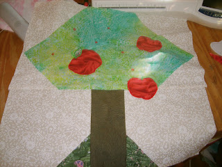 I appliqued a pieced block of the school right over the owl. It took rather a lot of time to get it just right, including but not limited to the hand stitched playground you see above, so this has a children's novelty backing.